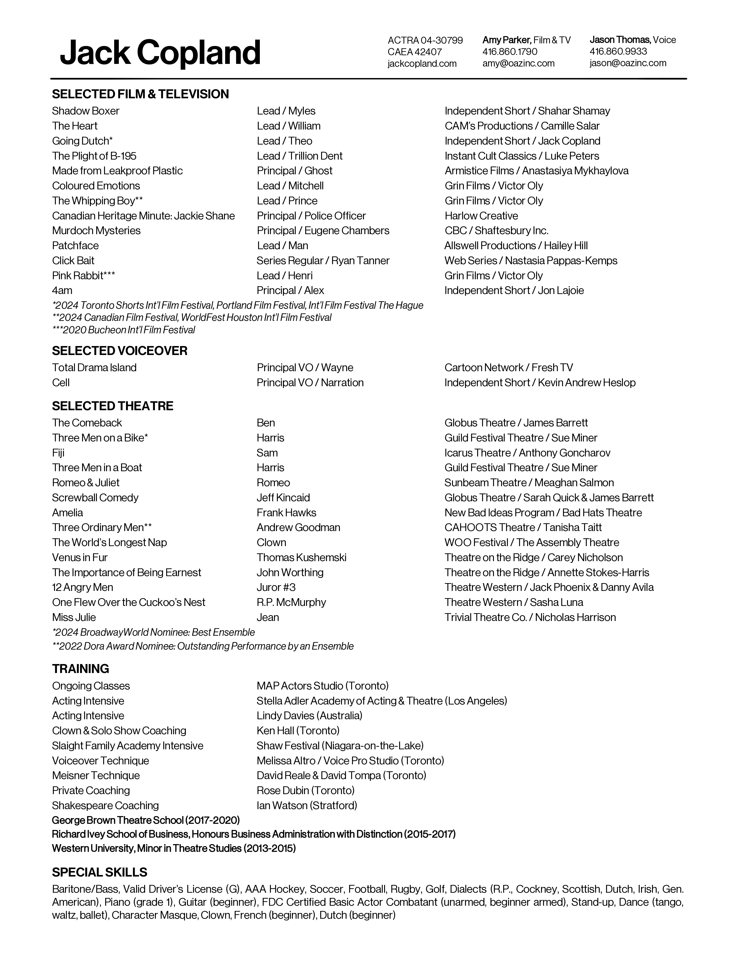 Jack grew up impersonating teachers, prank-calling friends, and watching movies on repeat. He was named Athlete of the Year in high school, studied Theatre at Western, graduated from the Ivey School of Business, and later trained at George Brown Theatre School.